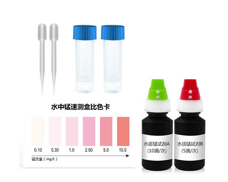 水中錳被檢測試劑氧化生成紫紅色的高價錳,含量越高顯色越深。