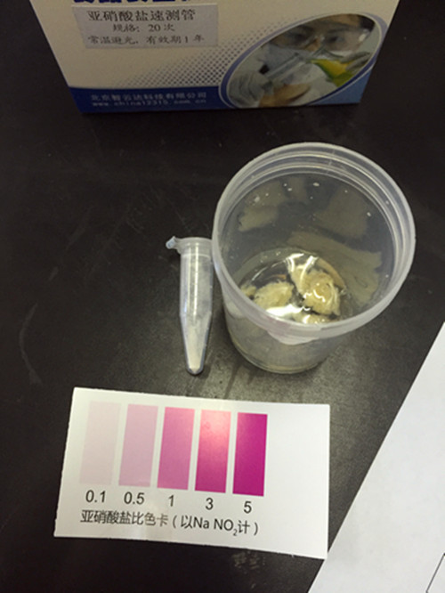 通過顏色比對(duì),我們可以清楚看到顏色由無色變?yōu)樽仙?,參照?duì)比卡,可知此樣本中的亞硝酸鹽含量為30~50mg/kg,屬于陽性樣本。