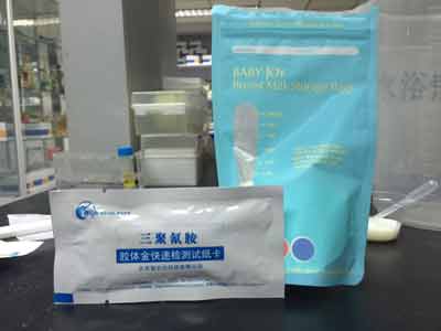 在3~5分鐘內(nèi)讀取結(jié)果,其它時(shí)間判讀結(jié)果無效。結(jié)果顯示為陰性,即沒有三聚氰胺,符合國家標(biāo)準(zhǔn)。